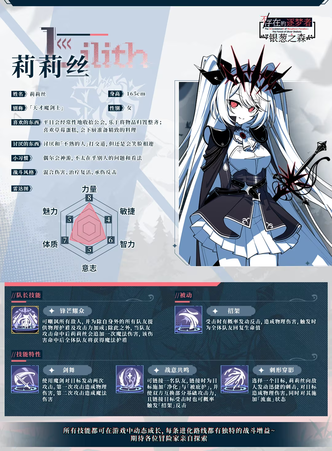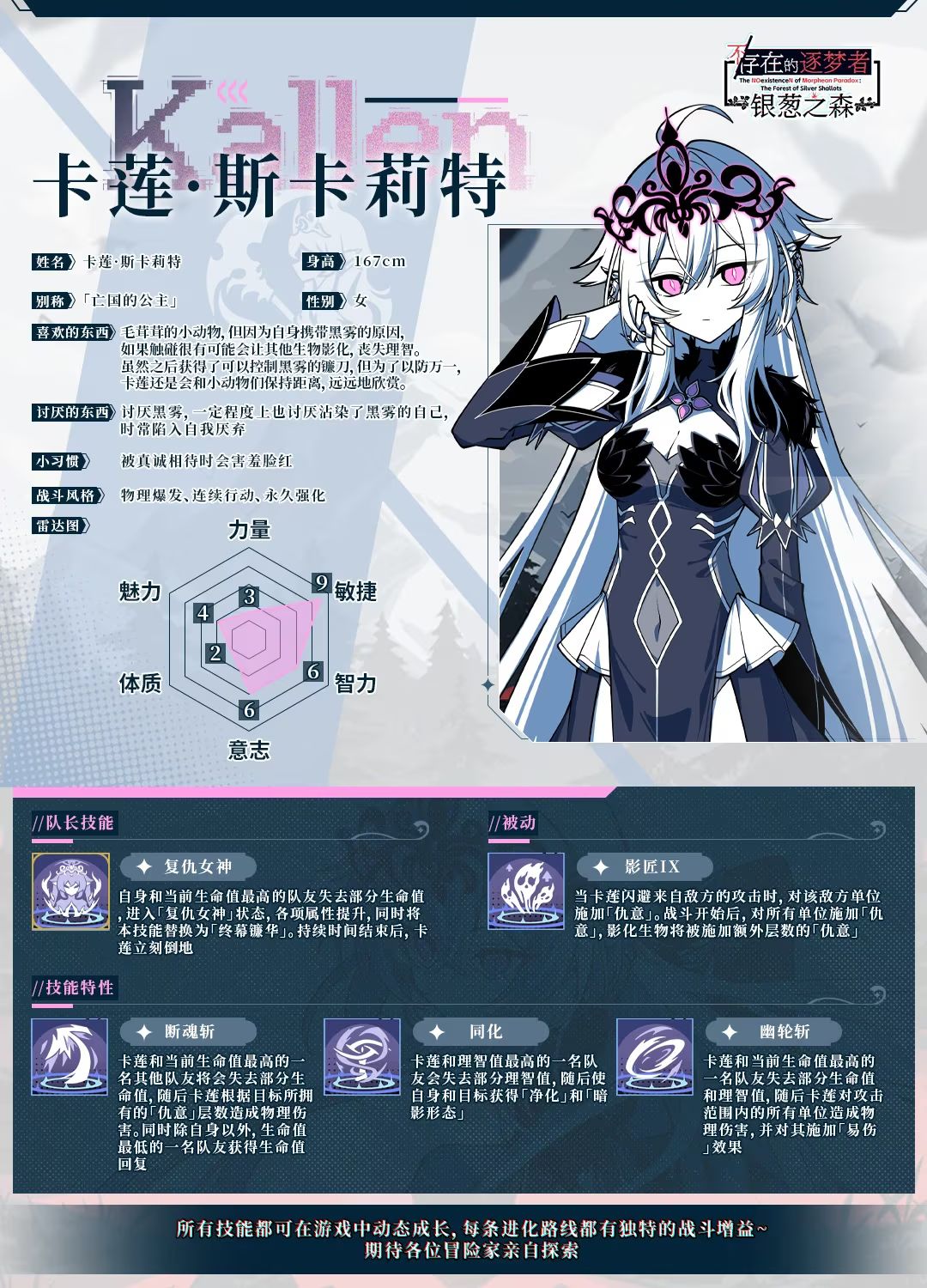玩家将在神秘场景"银葱之森"中苏醒,扮演身份未明的逐梦者,在各大势力阴谋交织的森林中探寻真相。游戏采用公会管理+日程规划+策略战斗的复合玩法,每位角色拥有6维数值与专属技能树,通过训练、迷宫探索、黑市委托等行动影响角色成长。50万+字文本量、10+个多线结局,玩家的每个选择都将改变世界走向。