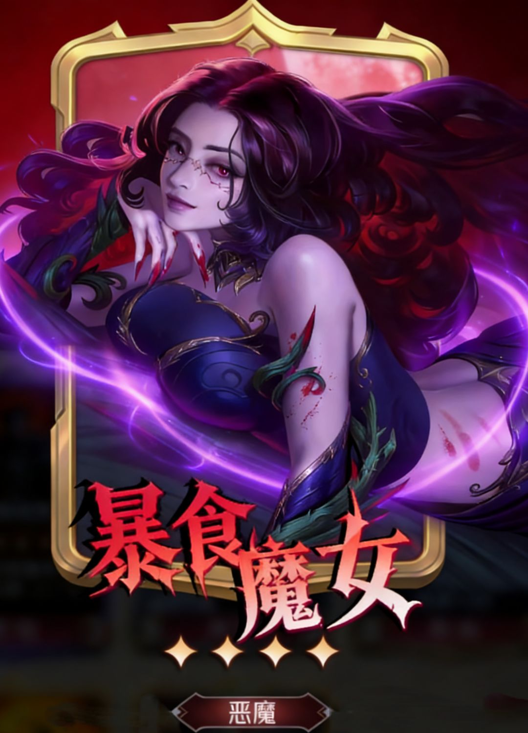 设计历程:原画和名字均来自于狼人对决大师模式的卡牌(后两个也是)。大师模式暴食魔女自曝技能获得墓地伙伴遗言,由此处得到灵感,想给恶魔种族设计一个可以拥有遗言的伙伴。同时,护盾+遗言的设计,也让恶魔5本前的战斗更强。甚至你可以让魅魔给暴食魔女加成变为属性最高,额外增加技能频率。