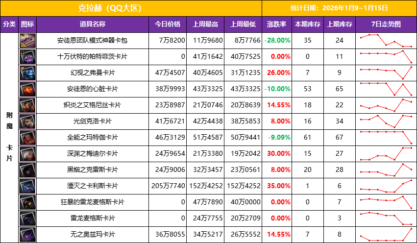 同微信区一样,雷龙的两张卡片市场都没库存了,其他附魔卡也不同程度的减少许多,往好处想就是卖掉了;后续版本来看,预计这样的涨价趋势还会持续一段时间,起码坚持到下周是有可能的,这段时间有打算练新职业的玩家,不着急打造的可以等一等,等价格下跌时再入手能省下不少泰拉,反之就随行就市,能卖的赶紧卖掉。