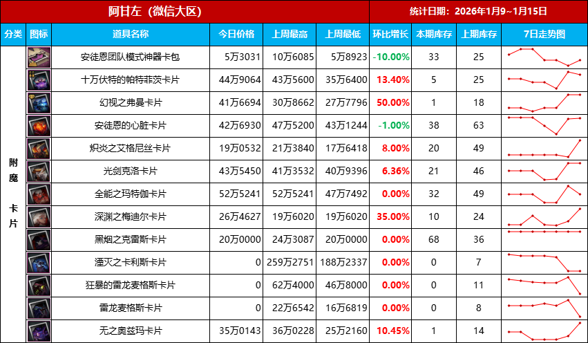 上周说过男圣职上线会拉动部分市场需求,但总体不会太多,如今从市场价格到库存来看,确实如此,真正有钱有资本的玩家早就给新职业囤积好库存了,后知后觉的也能消化一部分,但还是那句话,附魔卡不像其他材料道具那样可以反复使用,用一次基本不会再考虑第二次,眼下市场热度不错,抓住机会尽快清仓。