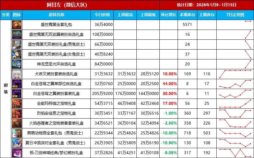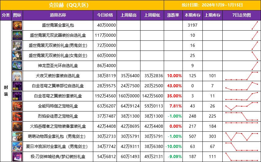 白金苍穹的价格涨了不少,单件礼盒甚至卖断库存了,套装礼盒也从上周的11件下降到本周的3件,库存量少价格自然就会上涨,目前这个节点对有库存的玩家是好事,说不定能借势大赚一笔,大唐时装当前正火,有打算上架的紧跟市场走就行,目前没什么悬念,往后就不太好说了,总之凡事趁热总没错。