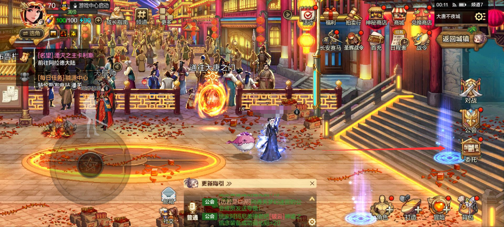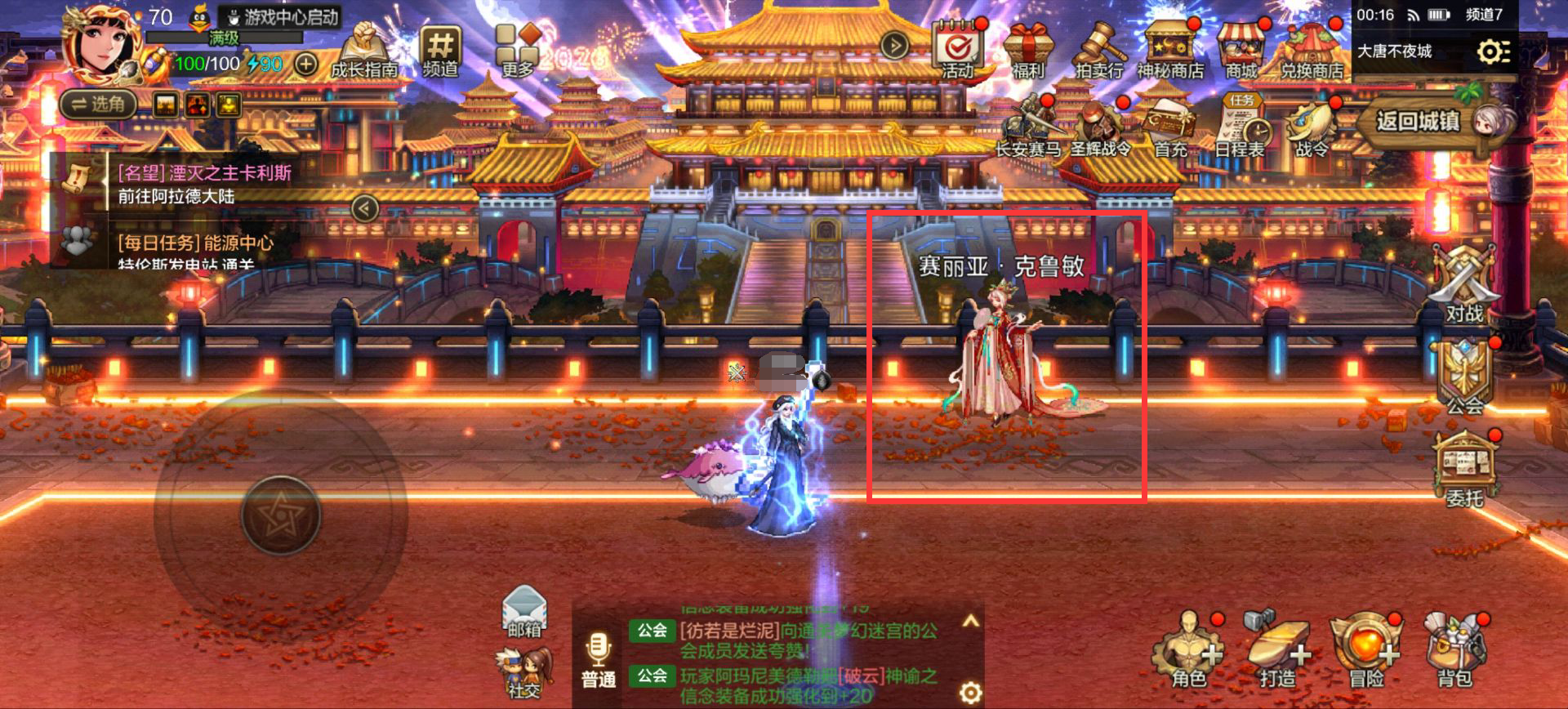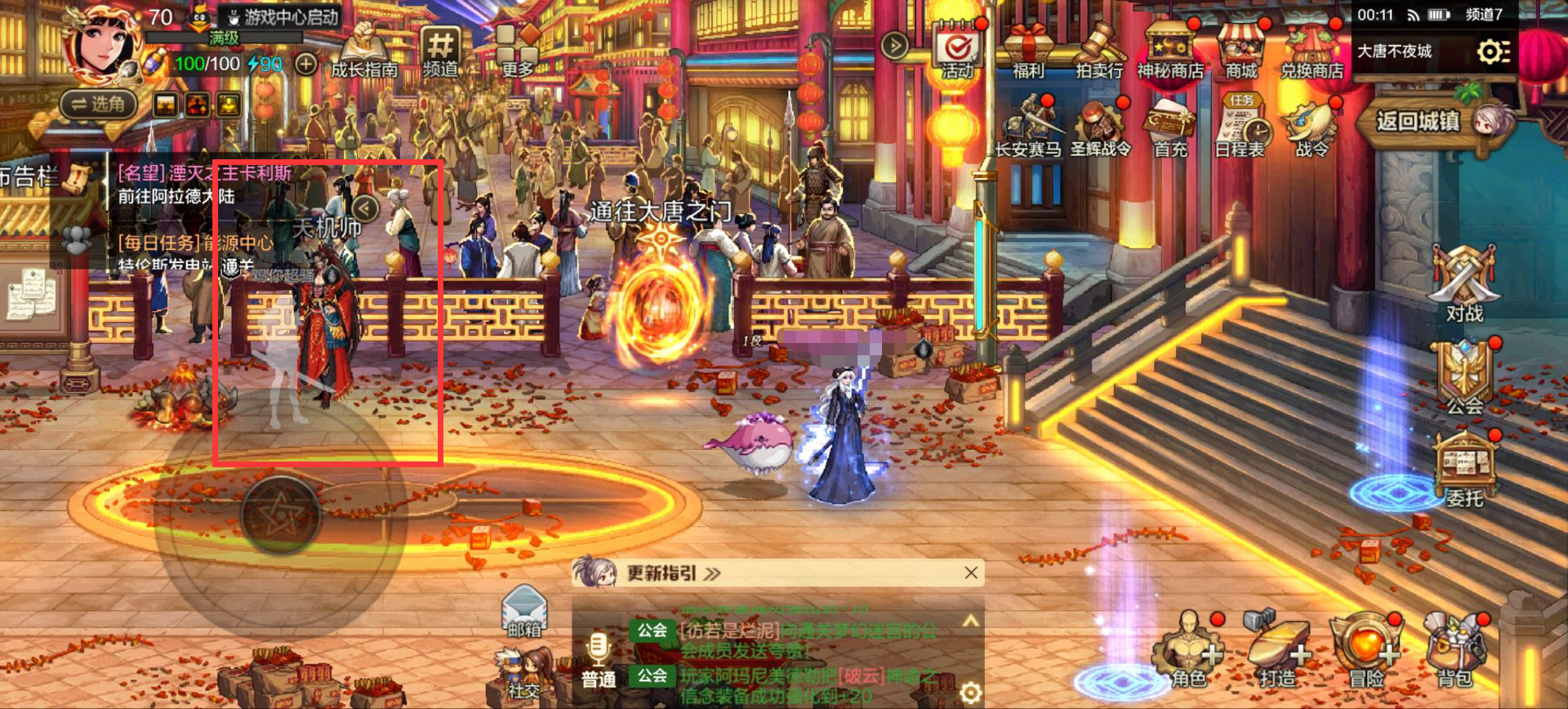 我们以图中引导“前往大唐不夜城”为起始,点进前往,角色默认位置如下: