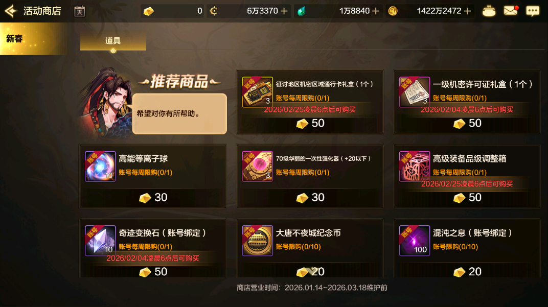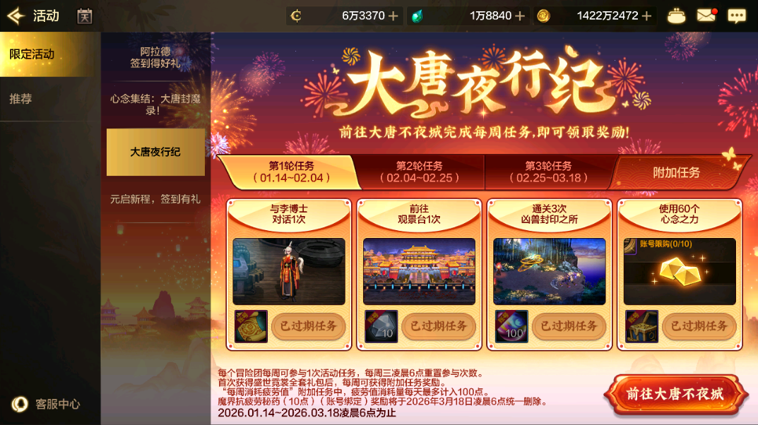 打一个福利奖励白嫖,需要每天/每周参与活动副本或其他方式完成任务。“活动商店”兑换的原则是优先兑换“每周限购”道具,兑换“账号限购”道具不急于一时,可在活动结束前兑换完毕即可;而“大唐夜行纪”活动的关键在于每个任务都可完成3次,切记每周都要完成任务领取奖励,不要错过领取福利的机会。