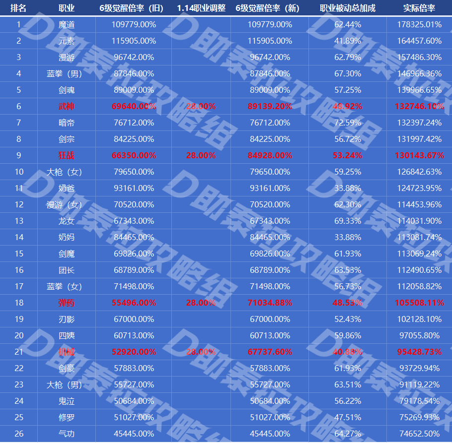 本次的职业调整,最难受的有两个职业,一个是弹药,增强的技能都是弹药的非核心技能,对其整体提升很小,另一个就是大枪了,大枪的觉醒后技能数据非常差,这次却没得到增强,不少大枪玩家都在吐槽这件事;其余增强的3个职业,对这次增强都是很满意的,尤其是狂战玩家,武神玩家则是完全没想到这次增强会带上她们,本来还沉浸在顶氪玩家一脚秒龙的还债中,得到增强可以说是一个巨大惊喜了。。