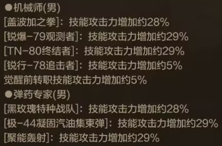 再来看下弹药和机械,这俩职业对于觉醒的依赖程度不是很高,并且本身觉醒伤害就非常低了,机械的buff技能还是老掉牙地增加智力数值,增强后依旧是倒数的觉醒数据,不过这俩职业并不依靠觉醒打伤害