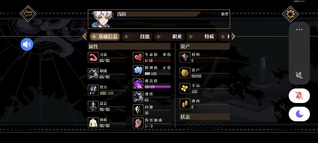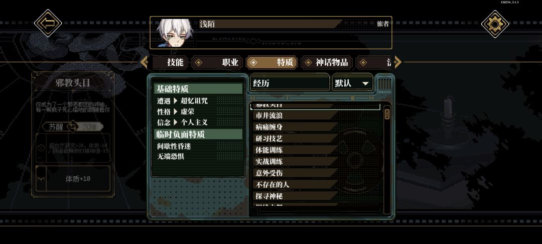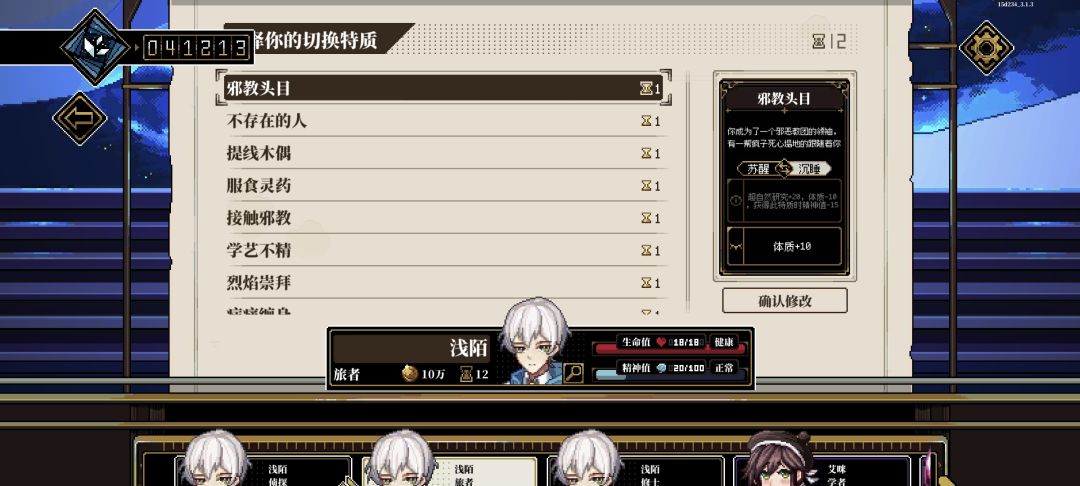 刷属性:这个主要在幕间进行,我们到了后期会有很多特性,里面有加属性也有扣属性的我们先反转到扣属性的方面,然后在休息里面进行加点(休息最高只能将属性加到60点)一直到60点时,再将反转过去的属性转到正面或无负面就可以进行属性的叠加了(如果有一项属性全部减完后没低于60就不用反转了)