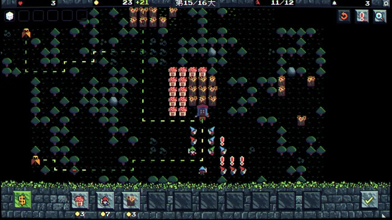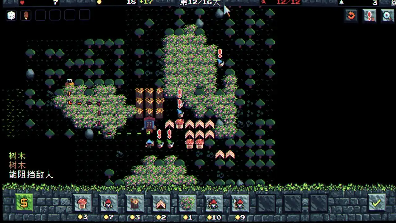 好消息是,由于一整局的时间较长,因此在你因为策略问题而导致失利失败之后,还可以选择在该轮重新战斗,可以说只要你游戏的整体发展思路没有问题,靠反复重打寻找经验也未尝不是一种玩法。不过游戏中还有许多“毒瘤”建筑,在游玩时需要专门留意一下。比如游戏中有一个每轮自动蔓延的荆棘,哥布林踩到之后会消失并扣除一滴血,前期看似很强,但到了游戏后期,甚至连敌人的护盾都破不了,而且种有荆棘的地方无法放置建筑,当你看到满屏没用的荆棘,哭都来不及。