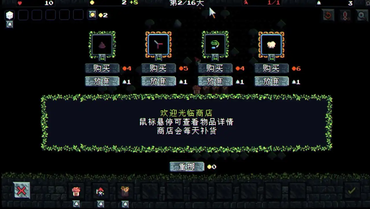 游戏中矮人的种类非常丰富,不过除了最基本的矮人小刀手之外,其他的矮人必须通过每轮刷新的矮人商店获取。其中商店除了可以刷新矮人之外,还会解锁圣器、作物、房屋等诸多设施,只有不断购买并且合理搭配各种设施,才能坚持到游戏最后。