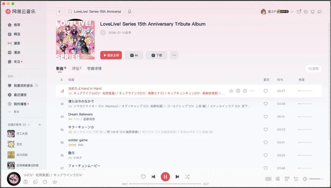 想要在线听的话,网易云音乐、QQ音乐直接搜 LoveLive! Series 15th Anniversary Tribute Album 的关键词就可以了。