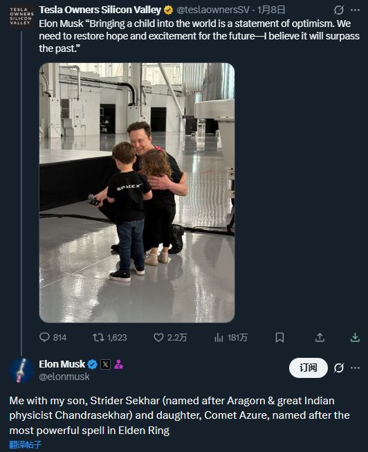 近日,马斯克在一条推文的评论区现身,解释了双胞胎孩子名字背后的含义。