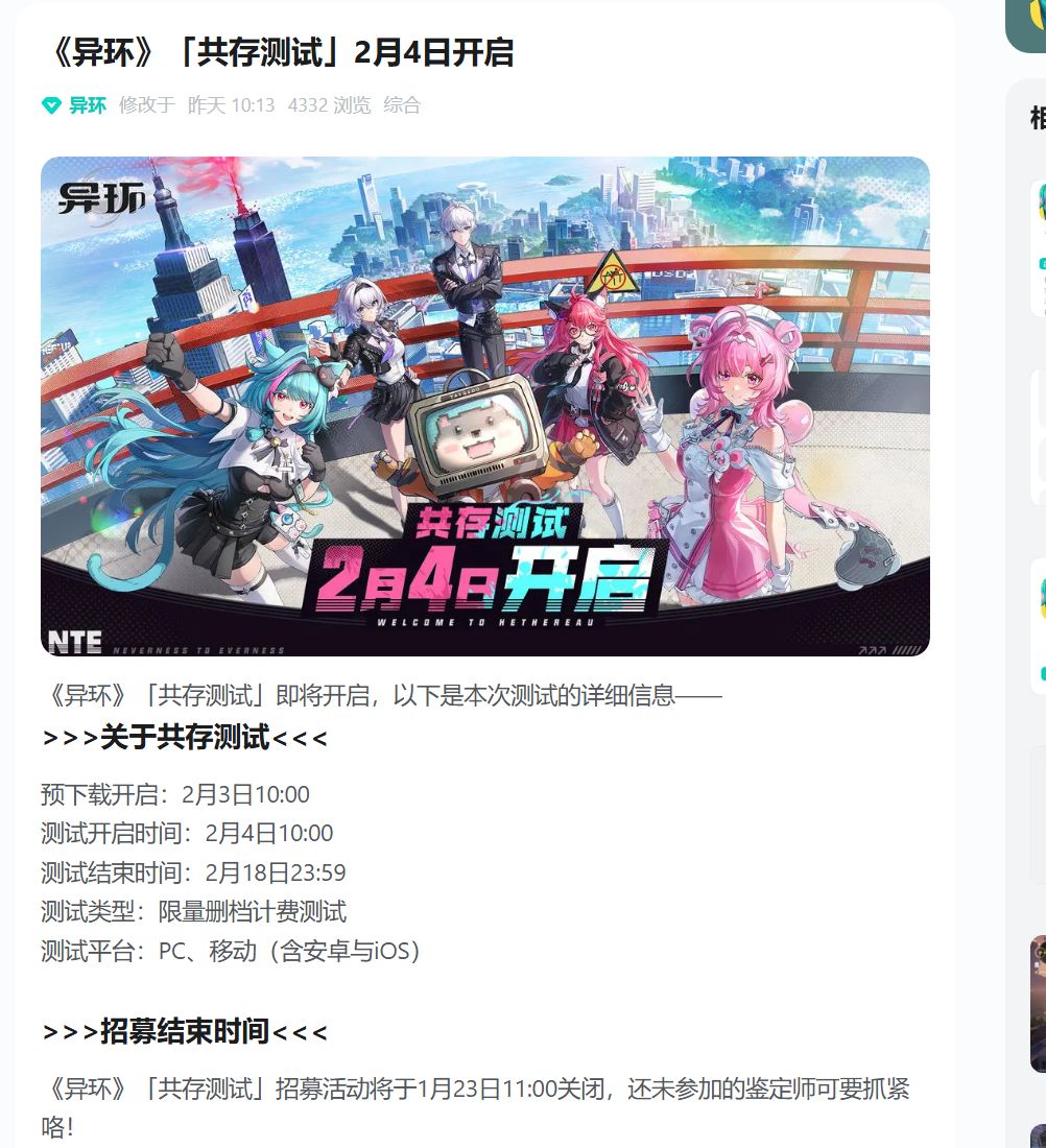 Hotta Studio正式宣布,旗下超自然都市开放世界RPG《异环》(Neverness to Everness)将于2月4日正式开启新一轮“异象测试”(限量删档测试)。本次测试将覆盖PC、移动端(iOS/Android),招募活动已于在官网及各大渠道同步启动。