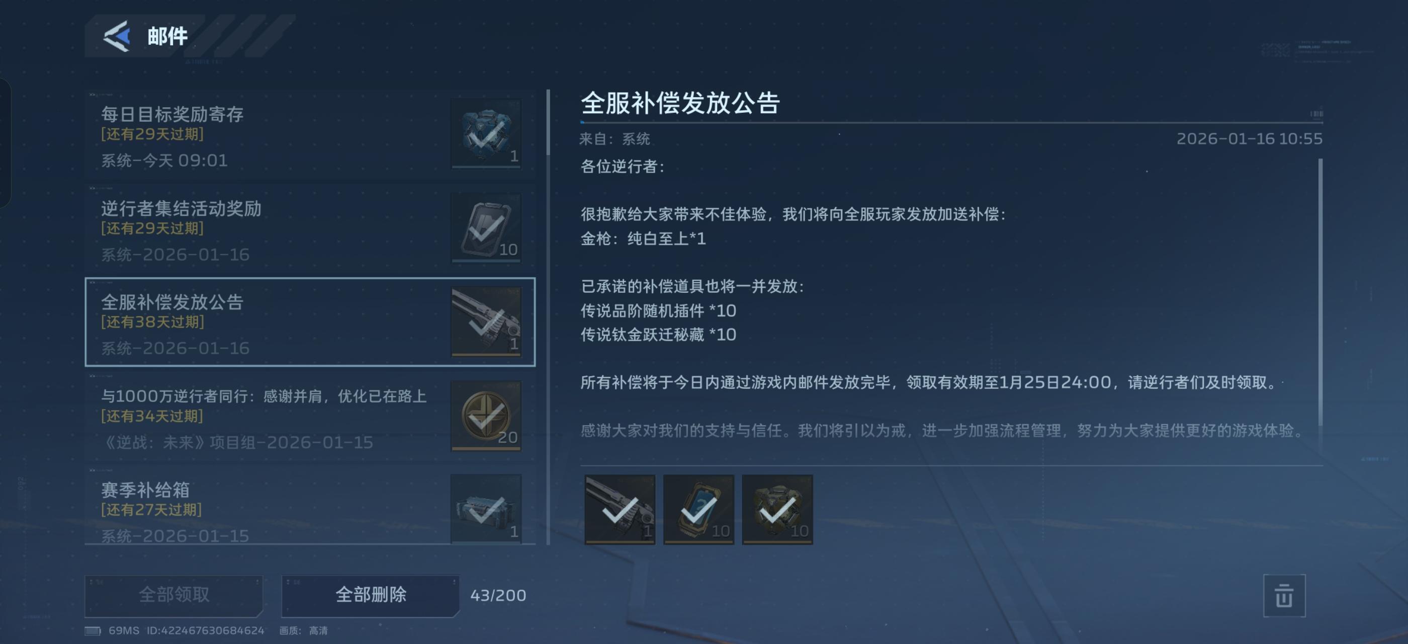 所有奖励邮件将在1 月 25 日 24:00过期删除!还没上号领取的兄弟,现在立刻打开游戏,把这把金枪和福利塞进背包!错过这波,下次不知道要等多久才能再遇到这么大方的官方了!赶紧喊上你的逆战搭子,一起白嫖到爽!#逆战未来首发征集 #逆战未来1月13日上线 #逆战未来攻略 #逆战重燃 #逆战未来补偿