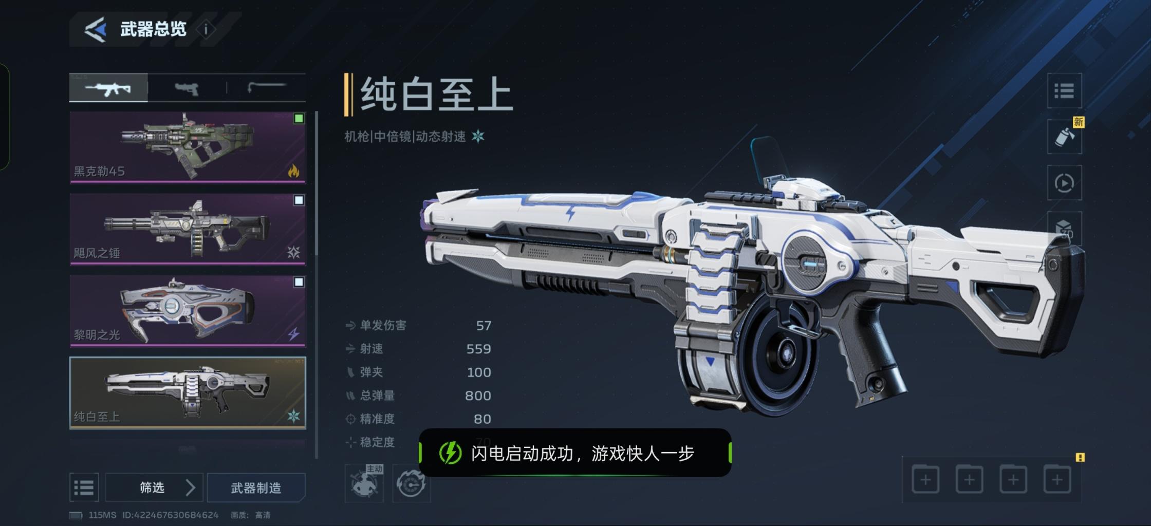 白嫖的金枪到底有多香?纯白至上作为一把中倍率机枪,不仅颜值拉满 —— 纯白机甲风 + 电光蓝纹路,拿在手里就是行走的颜值挂;性能更是不讲道理: