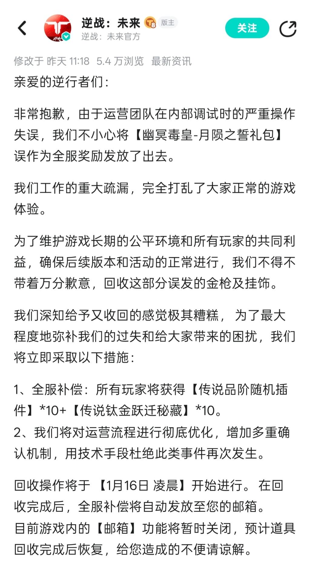 核心是 2026 年 1 月 15 日《逆战:未来》运营误将幽冥毒皇 - 月陨之誓(氪金限定)全服发放,引发 “白嫖” 狂欢,随后官方紧急回收并补偿的事件。以下是完整时间线与关键信息: