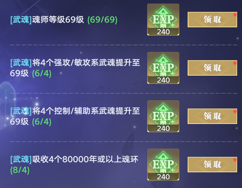 2. 斗罗之路任务:提前完成69级斗罗之路的任务可以获得大量经验,可以先不用领,为1.5版本突破70级做好充分准备。