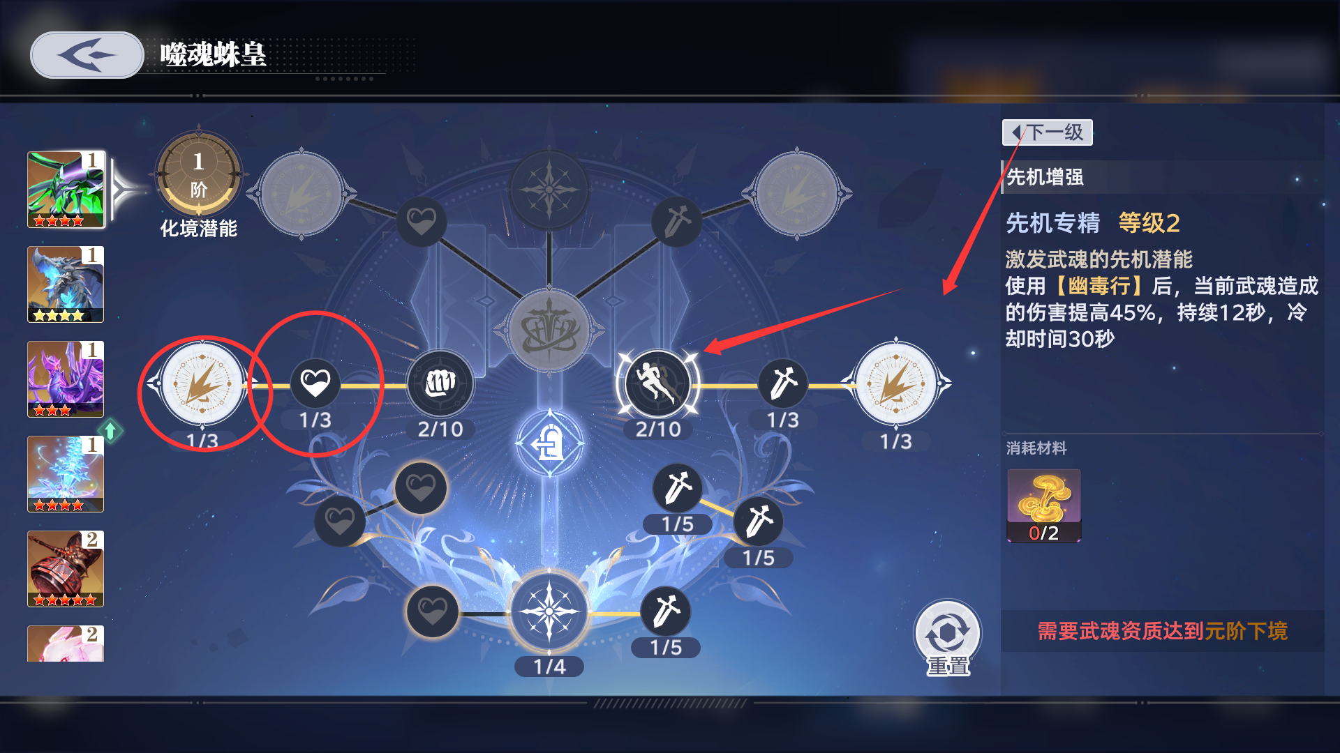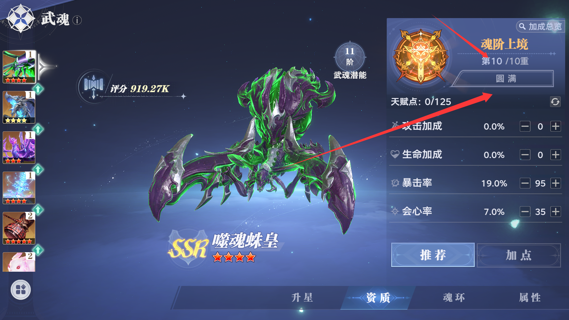 当武魂资质达到魂阶上境时,仙草潜能第二页的“先机”和“普攻潜能”可以点到2级,解锁攻击加成、会伤/暴伤加成等强力属性。