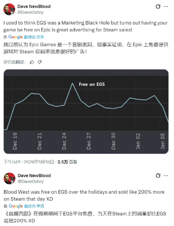 案例主角是独立FPS游戏《血色西部》,该作作为Epic假期免费游戏之一,于2025年12月20日开启限时免费领取。出人意料的是,大量玩家因习惯在Steam游玩,即便Epic可白嫖,仍选择在Steam付费购买甚至打折入手。数据显示,游戏Epic免费当天,Steam销量直接暴涨200%。