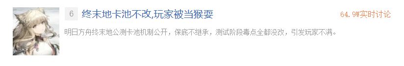 《明日方舟:终末地》公测卡池机制正式公开,核心的保底不继承规则搭配测试阶段争议毒点未做优化,瞬间引发玩家大规模不满,相关话题在社交平台持续发酵。