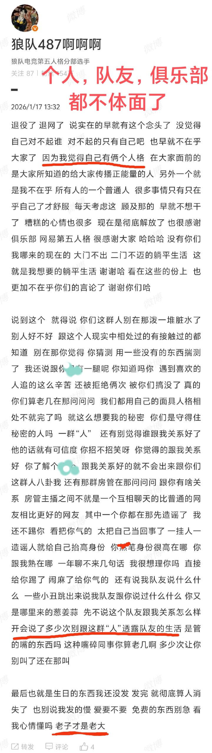 何添顺在长文中表示,自认为存在两个人格:公众眼中传播正能量的与私底下"不在乎任何人"的普通人。阴阳怪气“感谢”俱乐部、游戏及粉丝,让他可以生活躺平。吐槽队友透露其私生活。最后也没放过自己,来了一句“老子才是老大”……