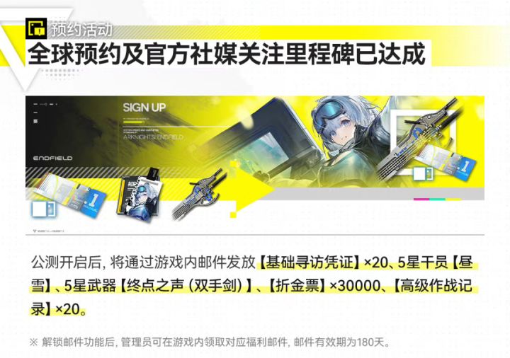 目前全平台预约火热进行中,全球预约量已突破400万,3500万预约里程碑奖励全部解锁。2026年1月22日全球公测开启后,玩家可领取5星干员【昼雪】、20张【基础寻访凭证】、5星武器【终点之声】等丰厚福利,助力快速开拓塔卫二新家园。