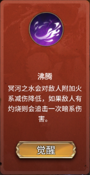 其三是冥河之水的觉醒技能--沸腾,它可以降低敌人火系抗性,进一步提高火羽伤害。