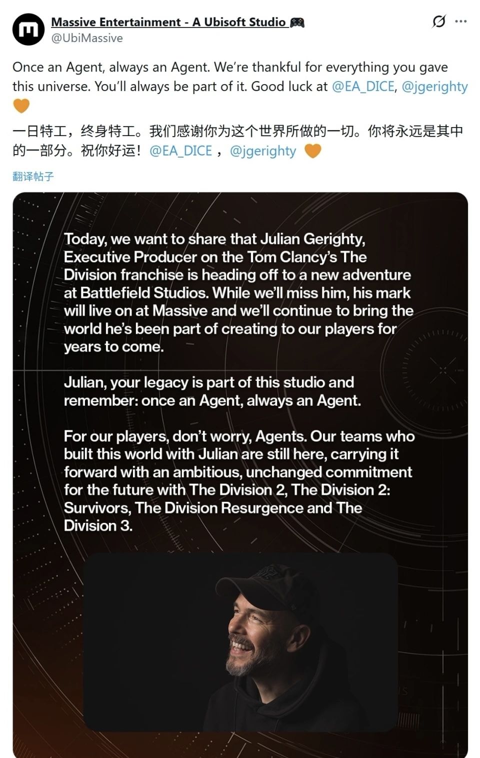 Julian Gerighty自1999年加入团队后,逐步成长为核心创作力量,不仅联合执导了《全境封锁》《全境封锁2》两款现象级作品,奠定系列开放世界射击游戏的标杆地位,还在2023年晋升为系列执行制作人,统筹包括新作《全境封锁3》、手游衍生作品及多款扩展内容在内的全系列项目。就在离职前一周,他还亮相相关游戏活动,为《全境封锁3》造势,称其为“正逐步成型的庞然大物”,承诺将带来“与初代同等重大的影响力”,这种“刚站台即离职”的转折引发玩家广泛关注。