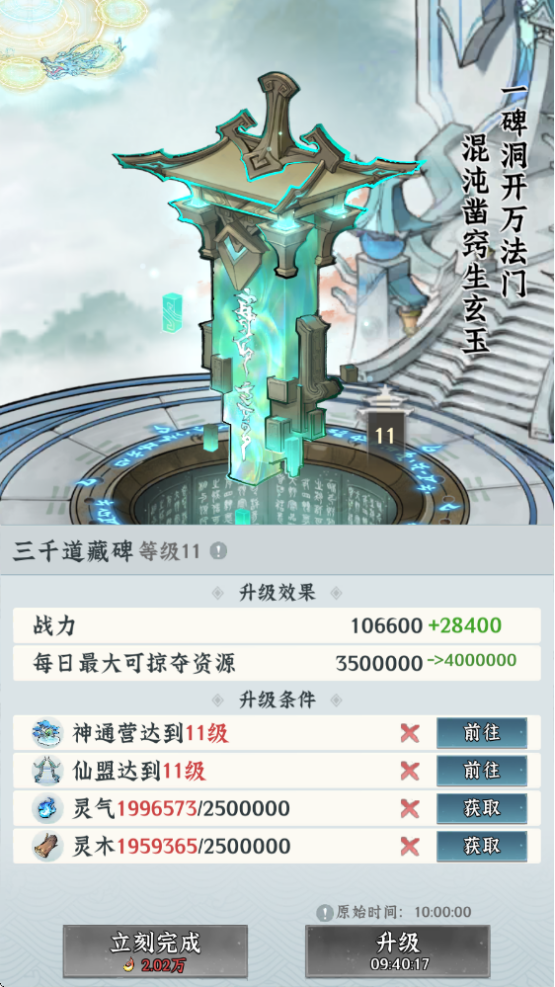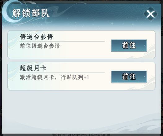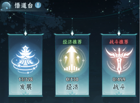 前期在边推主线边升级道藏碑的过程中,会解锁几个核心建筑,悟道台解锁后,大家会看到有发展、经济、战斗,三个参悟方向,其中发展能够解锁出征队伍,前期大家可以用一些资源先点出一个额外的出征队列。