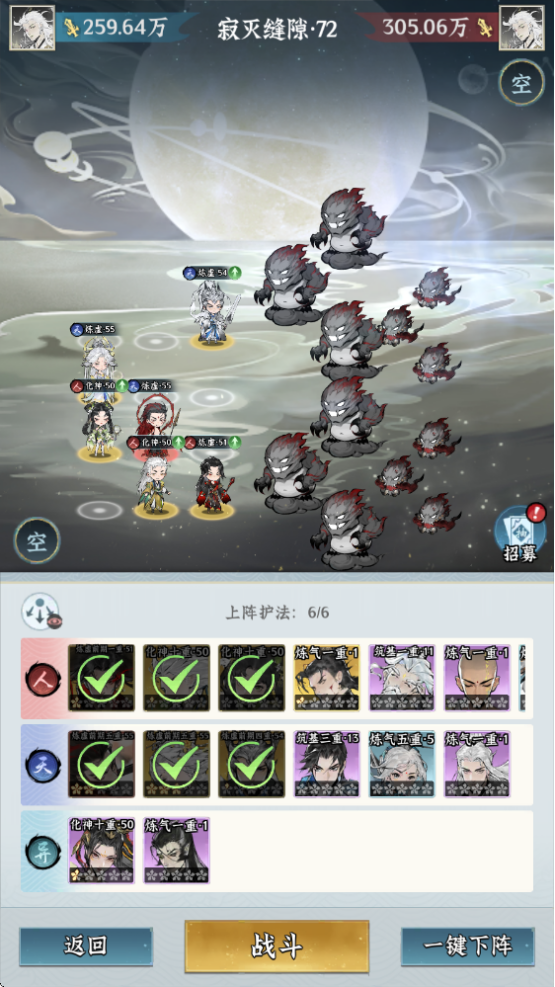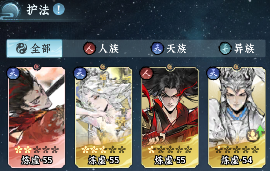 开荒期主要是PVE战斗,基本是一两个前排搭配四个后排护法的阵容。