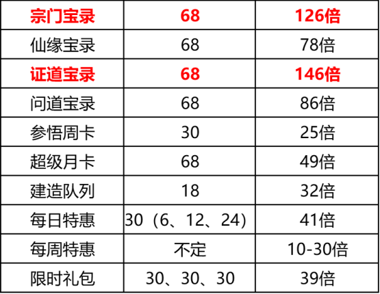 另外的资源获取方式,主要就是各类礼包了,其中除了常见的建造队列和月卡外,几个宝录的性价比似乎不错,宗门宝录和证道宝录,游戏中标注的优惠倍率都超过了100倍,其他礼包的优惠倍率也顺手记录了一下,大家可以参考一下。