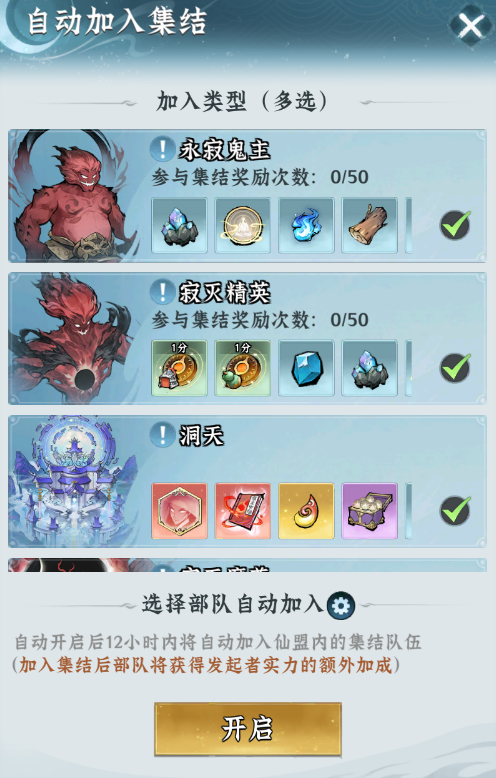 同时大家开启自动集结后,能够管12个小时,不仅是攻城,平常攻打巨型的寂灭鬼主、以及其他一些BOSS、从门等都能自动参战,非常方便。