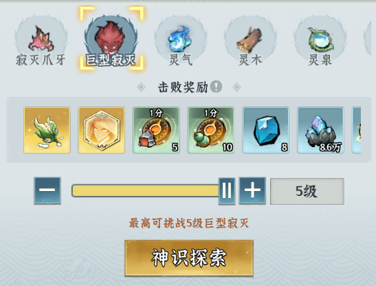 比较重点的资源获取渠道,主要是在大世界里面,点击“放大镜”,就能看到可以挑战不同等级的寂灭爪牙,不同等级的寂灭爪牙都能获得首胜奖励,大家可以不断尝试,一直到打不过为止。