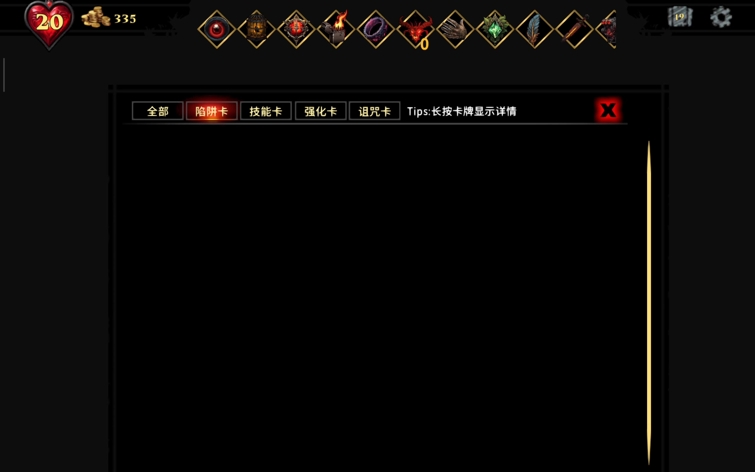 2、前期不建议多拿牌,一般是诅咒剑士成型了(最好参考上期用传火流先做好恶魔牌)能快速重抽且差不多删完手牌里的陷阱牌和技能牌之后,强化牌能拿多少拿多少,因为“修行者”搭配宝藏“新手小剑”能把手牌一次抽空,启动很快。