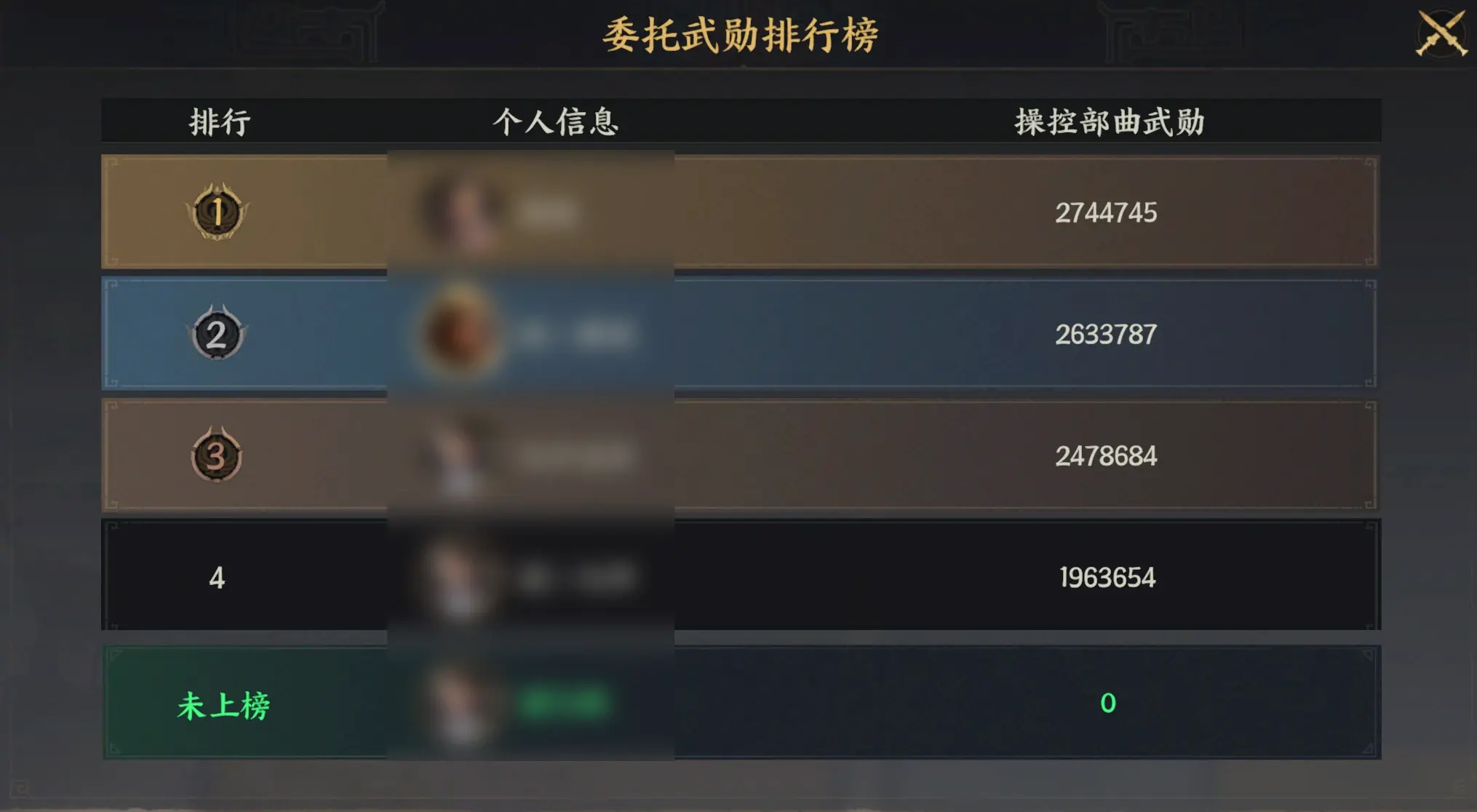 战场上的高光属于个人,而委托武勋排行榜,则见证了谁是最值得托付后背的战友!当您将心爱的部曲委托给联盟,那份沉甸甸的信任,最终化为了多少武勋?