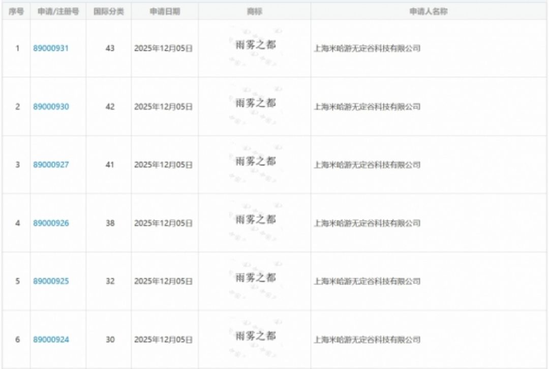 这一消息源于米哈游子公司近期密集提交的二十余项“雨雾之都”相关商标注册申请,目前商标已进入实质审查阶段。