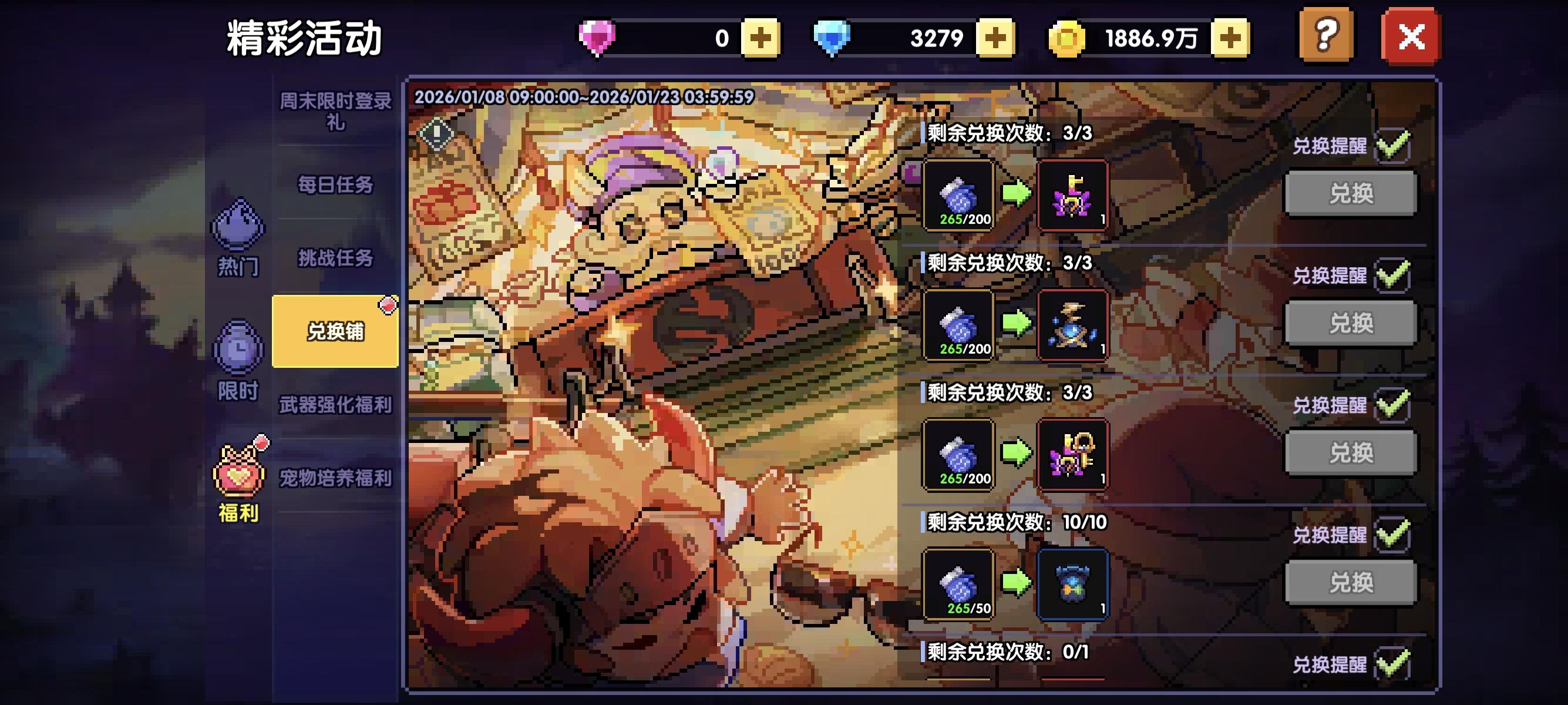 公会探险:每天挖矿和打史莱姆拿贡献币,多换宠物币或黄金币。