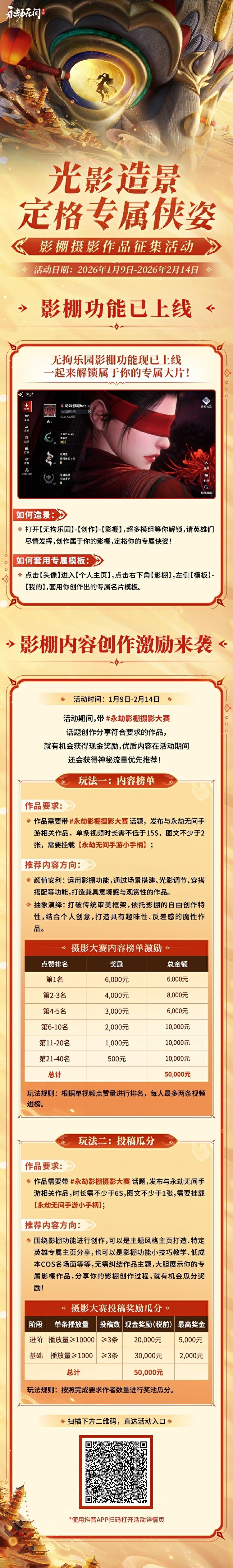本次的活动是以“光影造景 定格专属侠姿”为主题,围绕新上线的“无拘乐园影棚功能”开展创作征集。