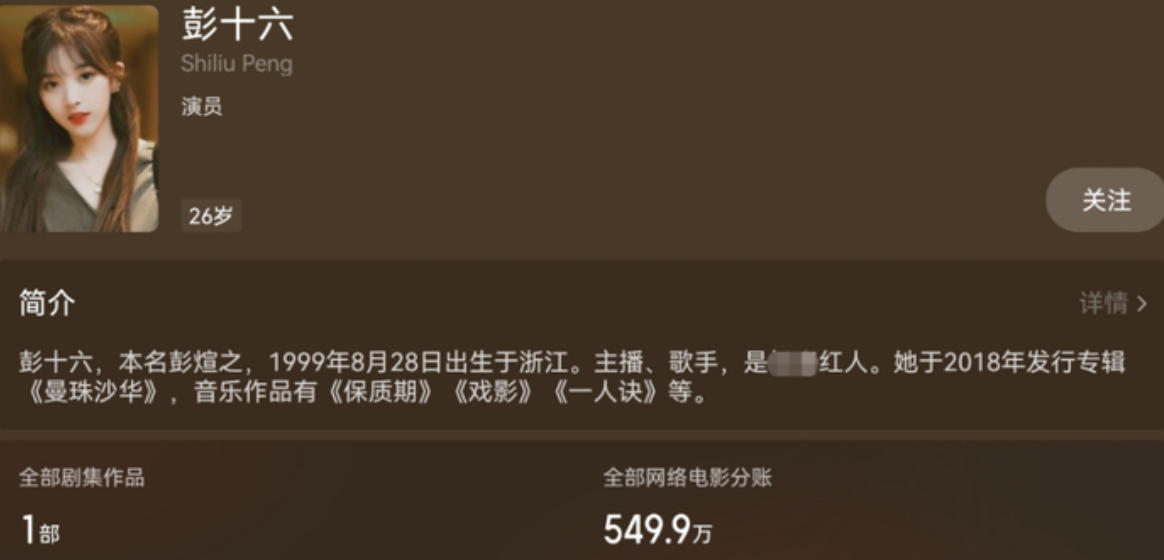 这次整改并非作品本身内容违规,而是因为主演彭十六。
