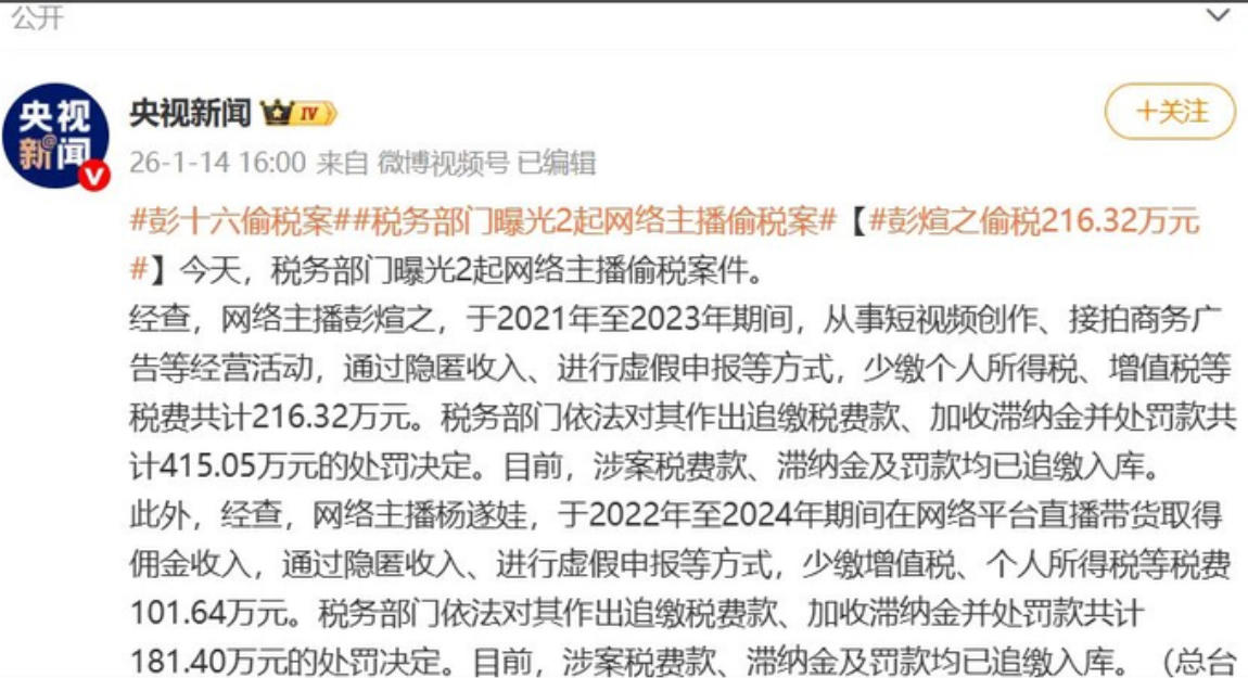 2026年1月14日,税务部门正式通报该案例,彭十六全平台账号被禁言,30天内掉粉超12万,相关作品下架,被明确列为劣迹艺人。