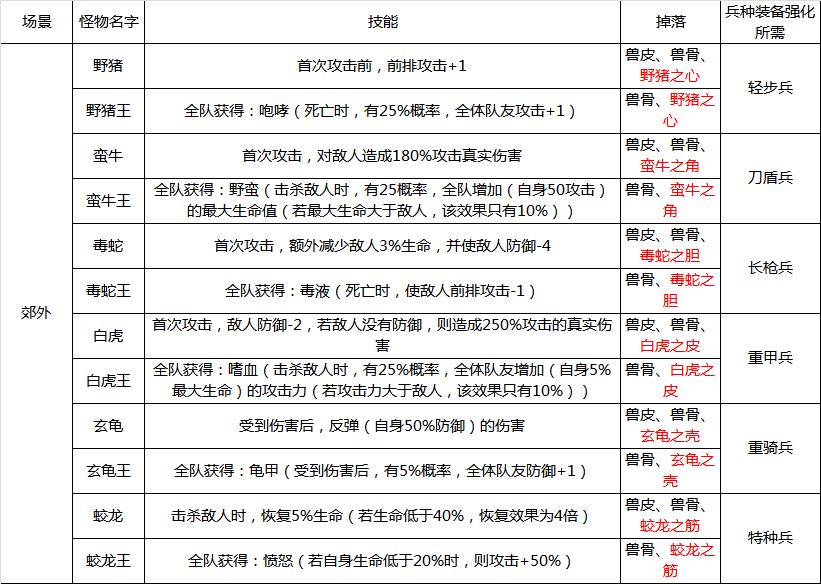 2.郊外:产出兽骨、卷轴材料,万杀以上产出杀戮之心。(膜拜消耗2000 6000 50000杀心)建议自动战斗刷到装甲一枪秒不掉为止。刚解锁杀心签到时,可以考虑带兽杀步兵重骑刷万杀猪蛇,炸弹扫荡白乌龟。