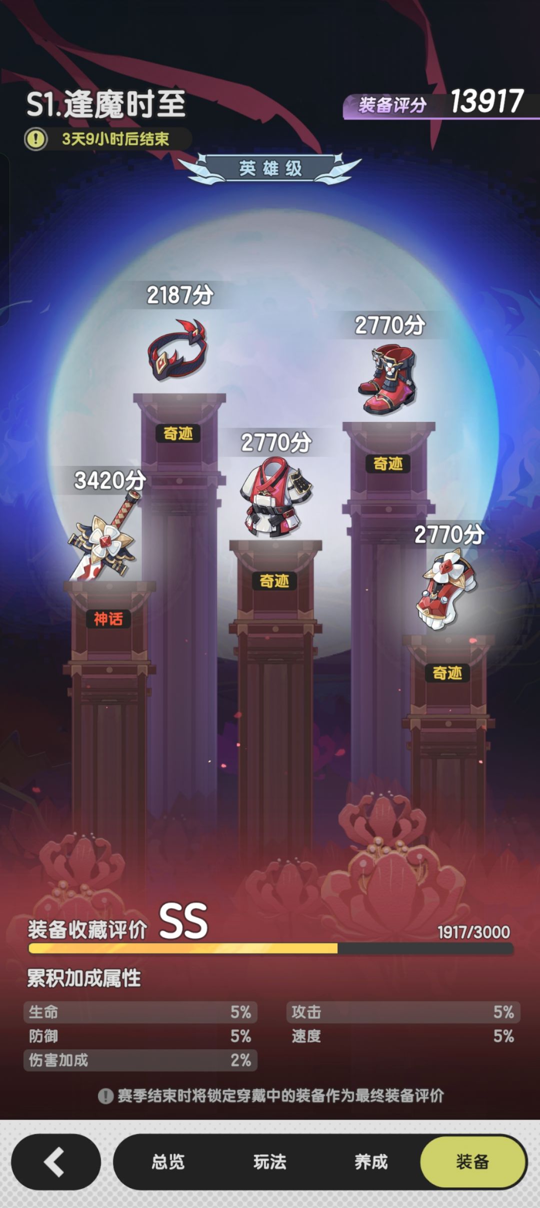 装备这一部分,我本来不想追sss评分,因为你做两件红装要200个碎片,如果你卖碎片能卖接近1w晨星,我认为对于我们低氪斗士来说用接近1w晨星去追一个2%的伤害抵抗是比较亏的,但是进噩梦第一天给我爆了一把红色大剑,就干脆追sss评分了。距离s1结束还有3天,还可以打两天的副本,第三天屯次数,这两天保底掉落64个红碎,手里还有36红碎,刚好能再和一件红装,完美!