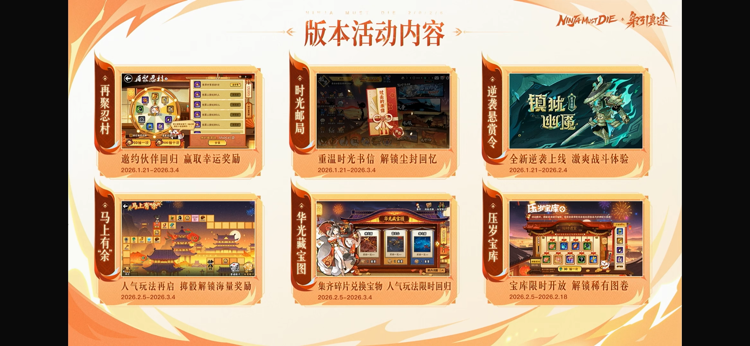 2活动:再聚忍村(忍魂重燃)、时光邮局、逆袭悬赏(改动:调整boss减伤特性机制,首通榜单结算后后减伤特性下降)、大富翁、藏宝图、宝库