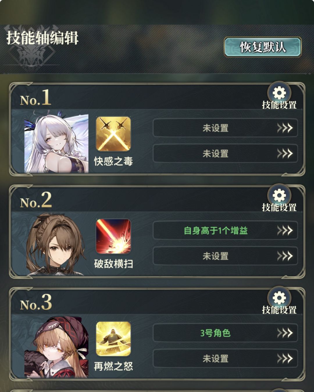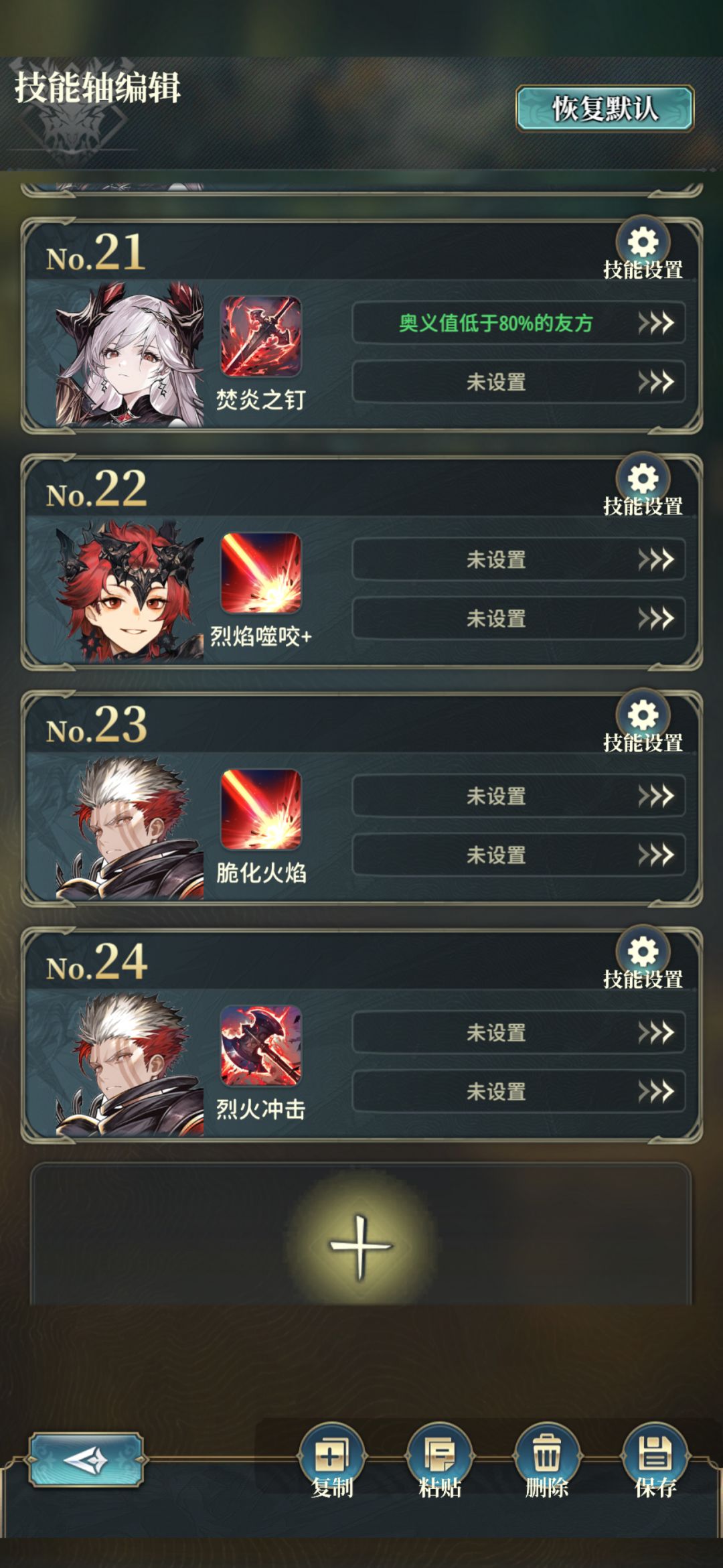轴方面,主要就是放欲望泉的优先级高,一般到能放的时候就要放,撑过75-50阶段。岛主的奥义再动给到菠萝。其他默认即可(更新:我把先锋的第一次敌对心推到第二个回合,这个技能要改的话放最前面,菠萝的炎钉建议80以下开,设置在最后两张图