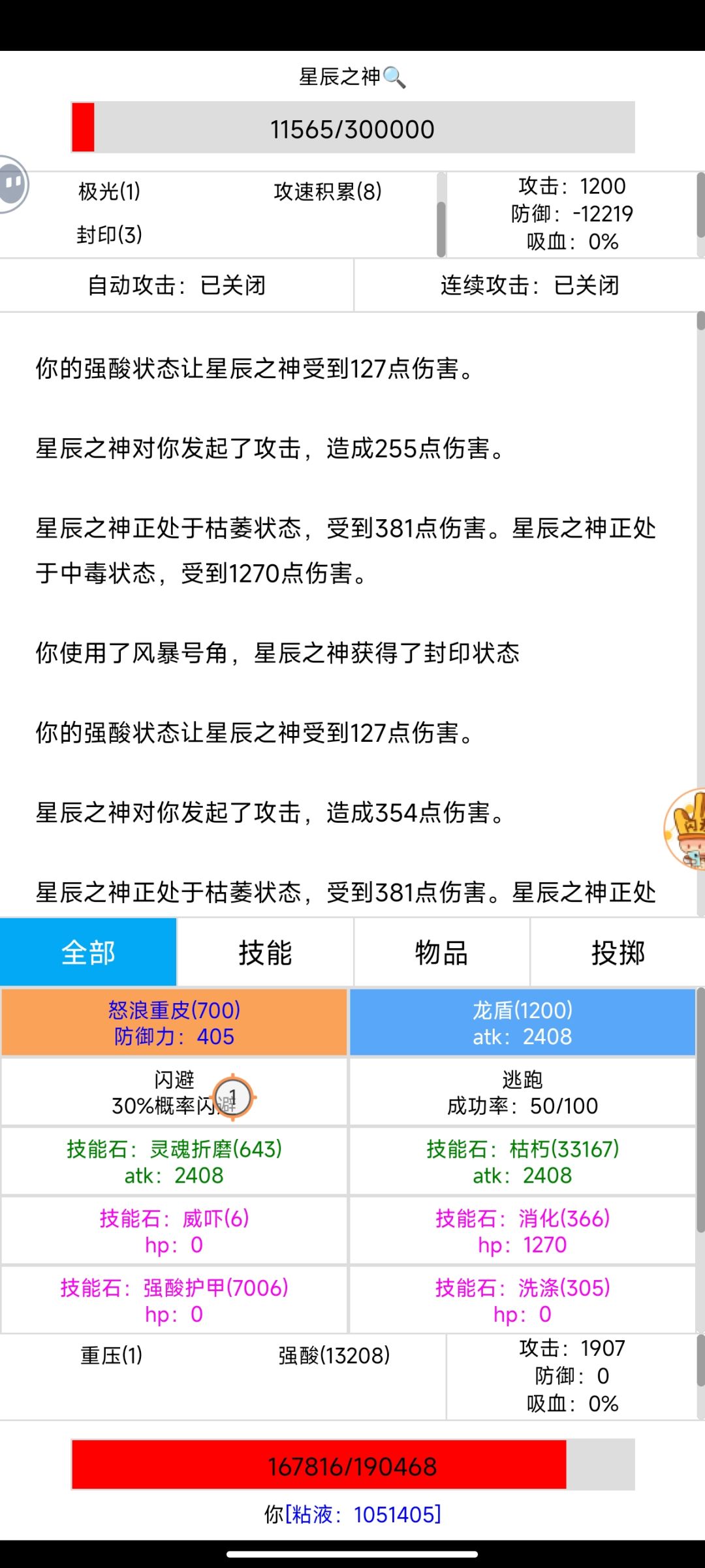 水之神 消耗粘液30万左右,神性药剂 100瓶,粘液护甲1000个,枯朽15000个。开局晶甲守护,龙魂之力,巨龙之力,生死转换,开始粘液护甲叠甲,叠到10500,开石甲术,防御12000以上,水之女神不破防,再枯朽打到死,连点器用时5分钟不到