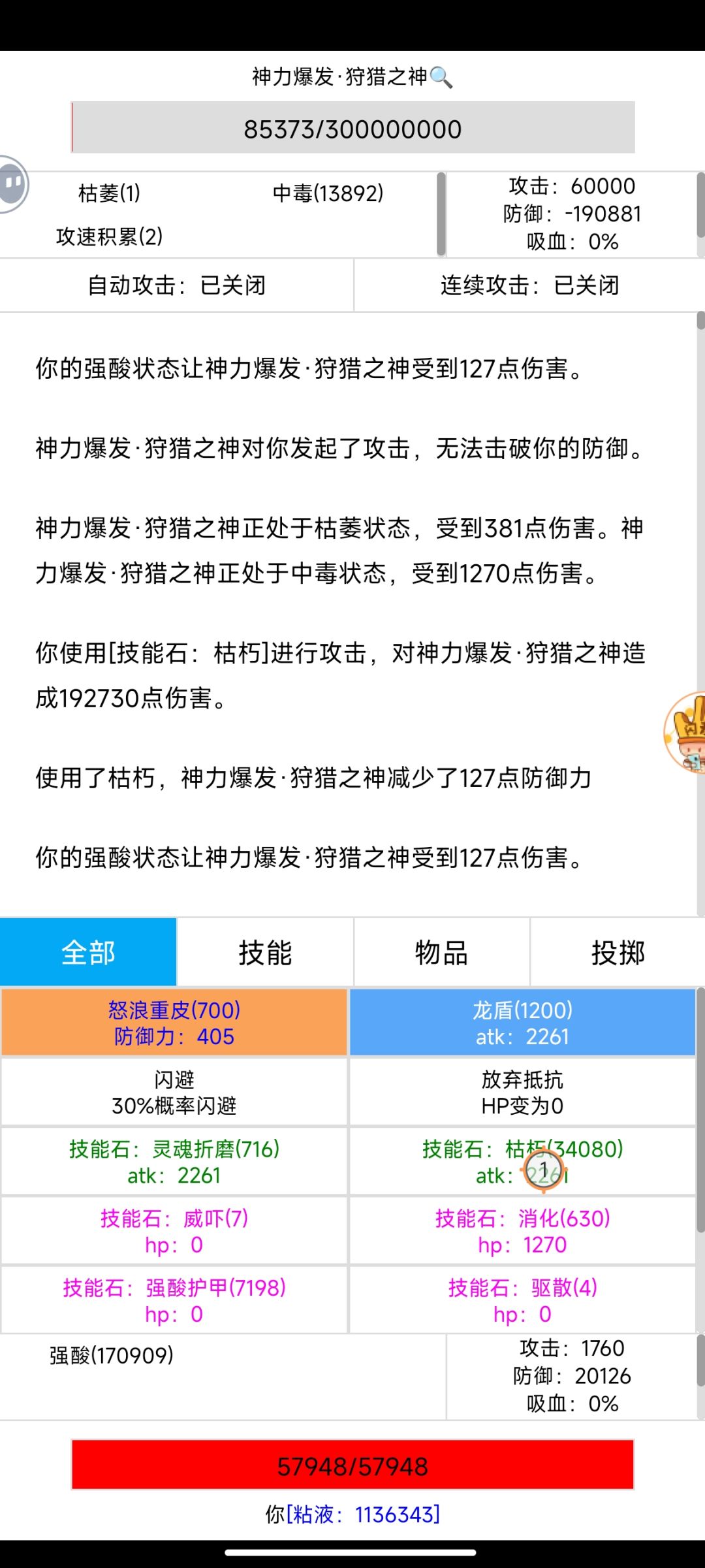 狩猎之神 消耗粘液30万左右,神性药剂200瓶,粘液护甲2000个,枯朽15000个。开局晶甲守护,龙魂之力,巨龙之力,生死转换,粘液护甲叠甲,叠到7850,开石甲术,连点器叠防御20000以上,狩猎之神不破防,再枯朽打到死,连点器用时10分钟不到