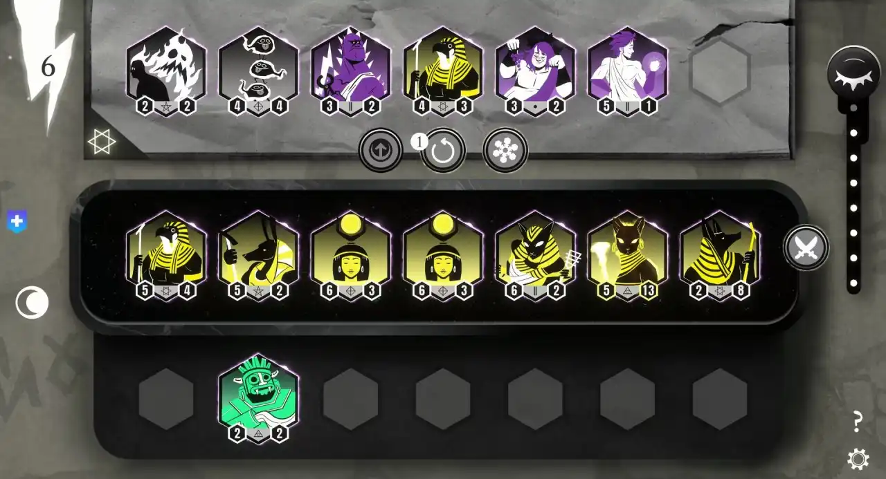 游戏玩法与《云顶之奕》类似,通过刷新卡牌,选择自己或者阵容羁绊所需要的神明。通过合理的运营思维来寻找等级与阵容之间的平衡性,稳步加强自己的力量。或者快速的升级来寻找能力强大的神明。