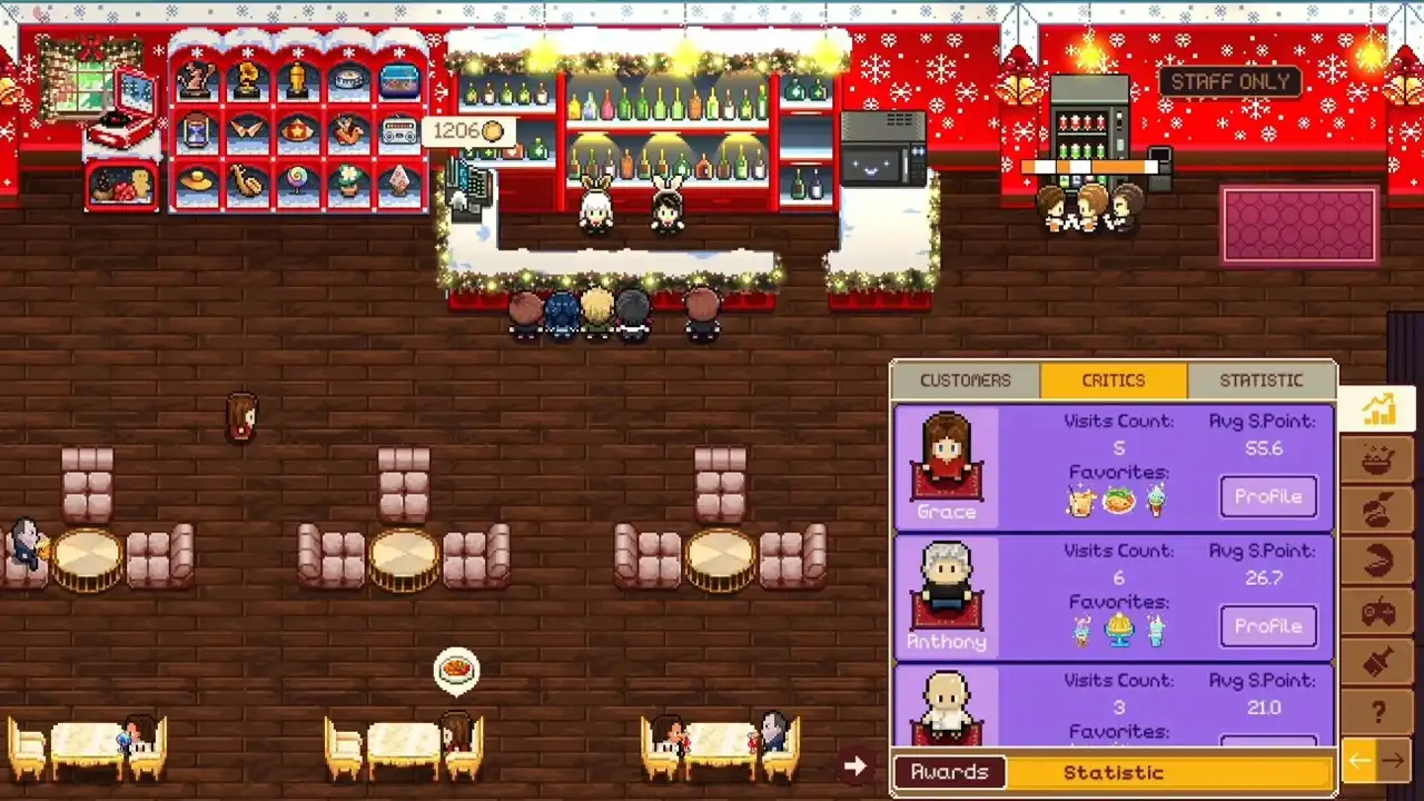 玩家们需要做的事情也很轻松,只需要定期为饮品和小吃补货,并将餐桌放置在完美的位置即可,如果你感到匆忙或者劳累,还可以招募员工帮助你工作。