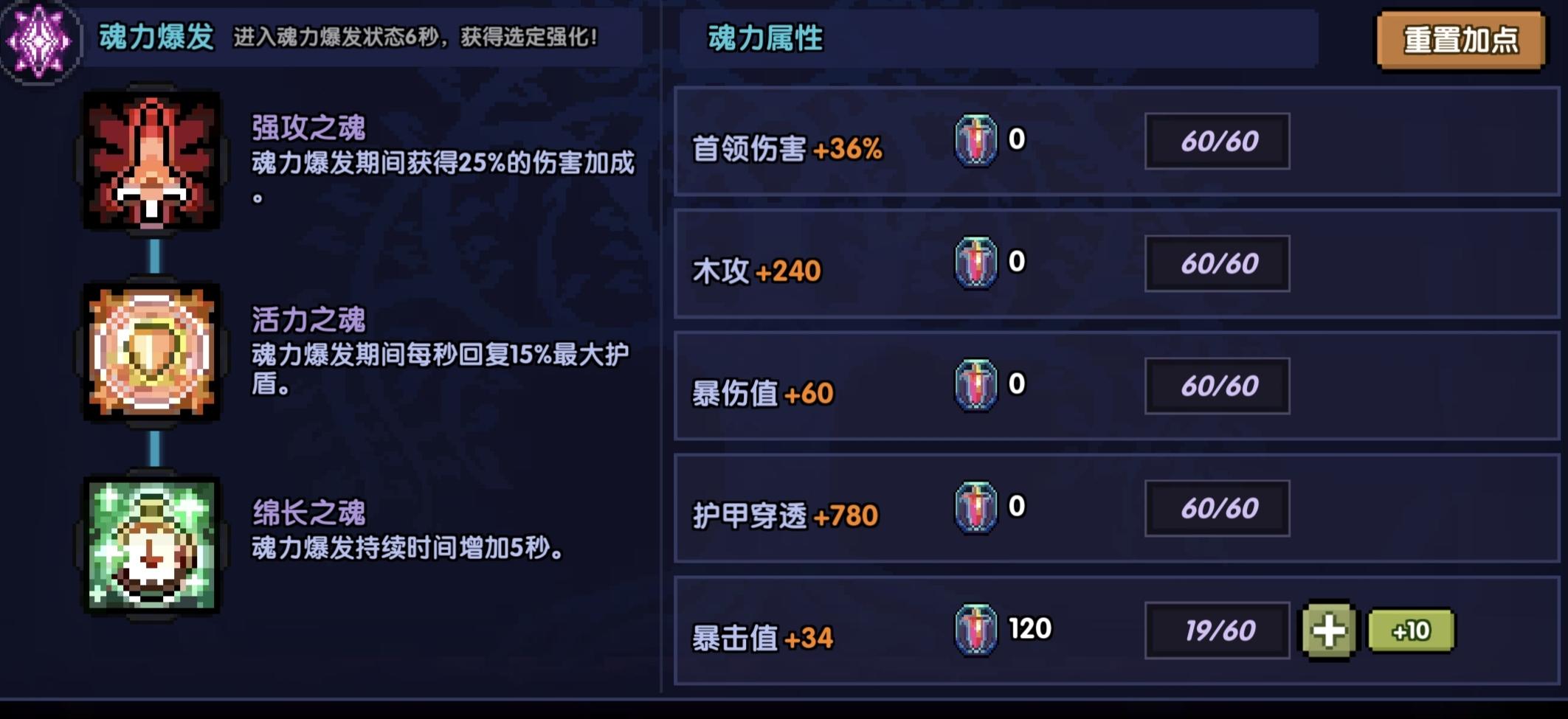 【魂力属性】优先点满首领伤害、木攻、暴伤值、护甲穿透,暴击值可以根据面板来加点。