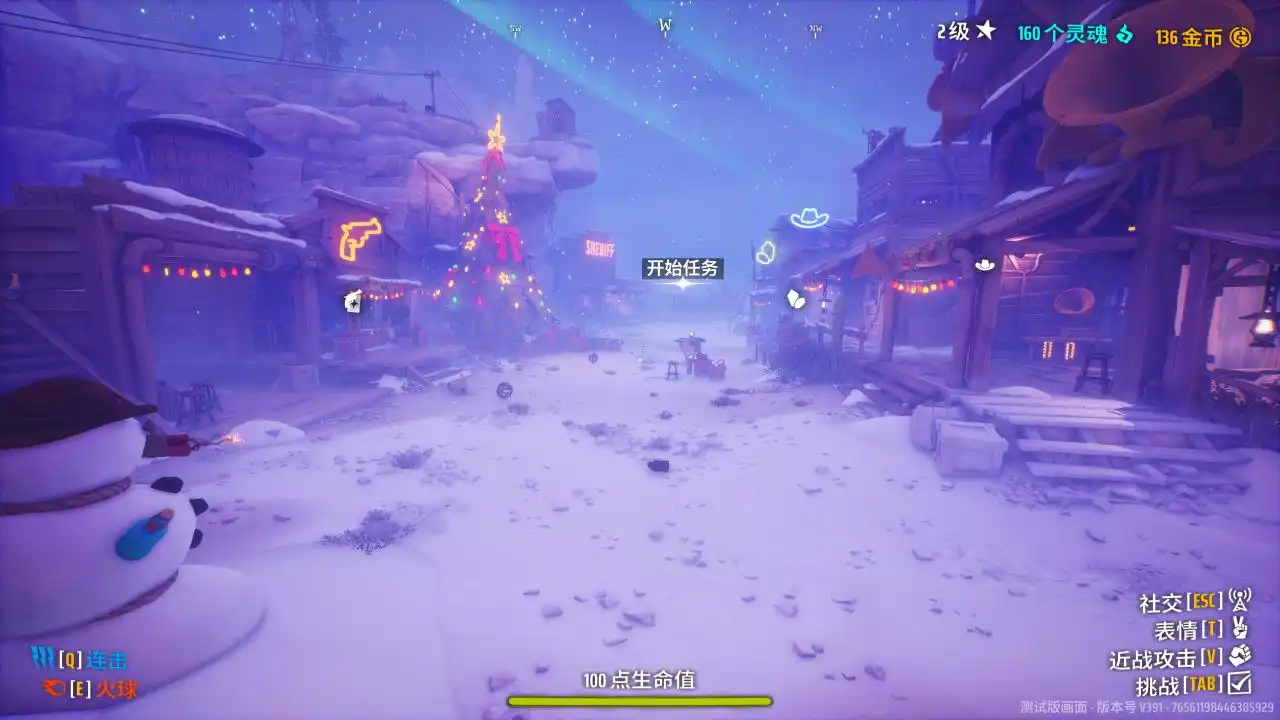 游戏开始的地方是一个下着雪的牛仔小镇,这个小镇的环境应该会随着季节或者节日而变化。当玩家对局失败或者成功撤离后,都会返回到这个小镇的酒馆中。在这个小镇上我们可以升级法术和武器,或者更换一些角色装扮等。小镇的中间有一辆小火车,玩家可以在那里接取任务进入到对局。
