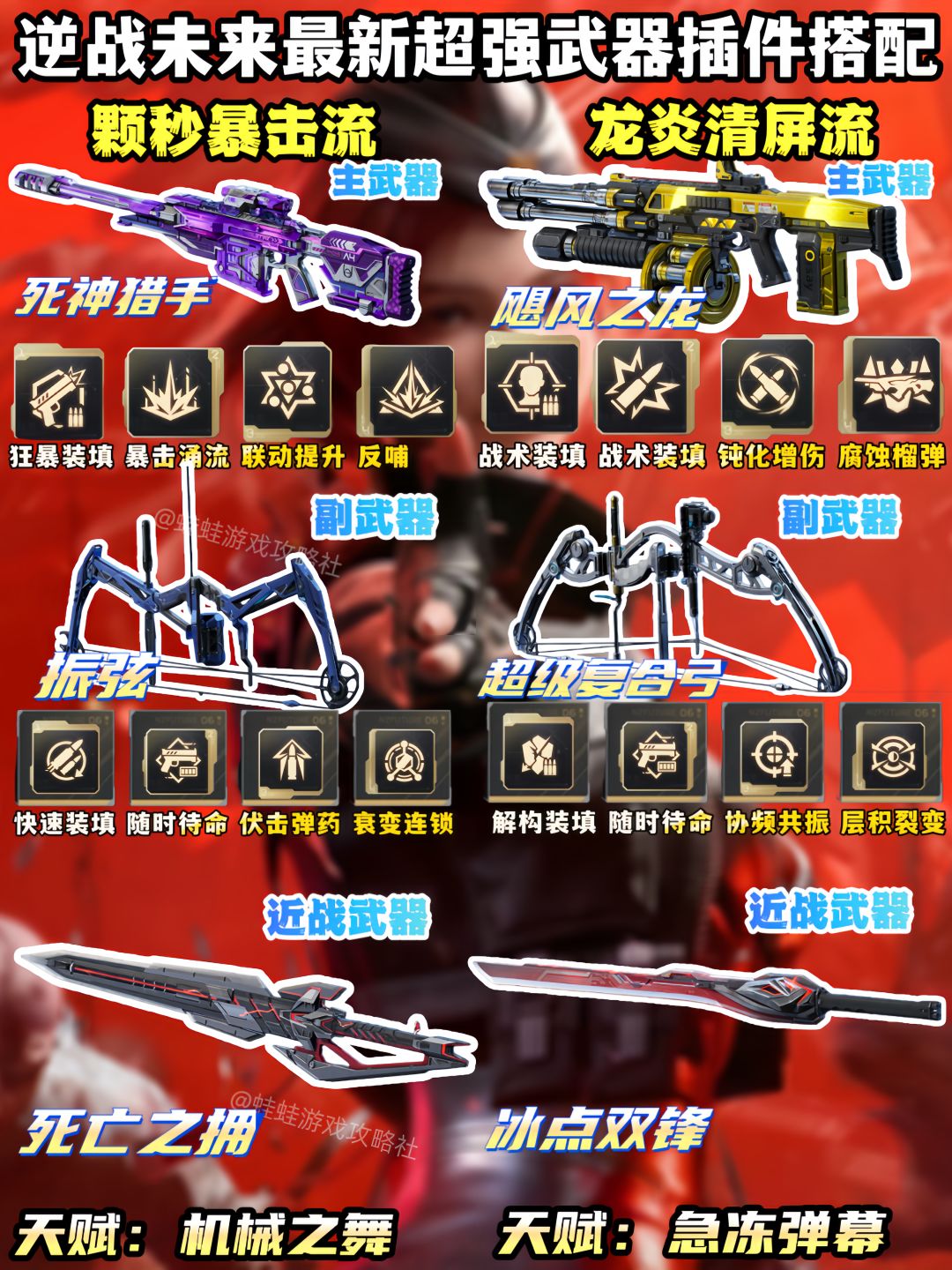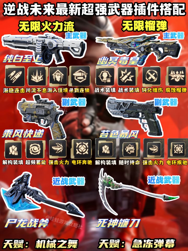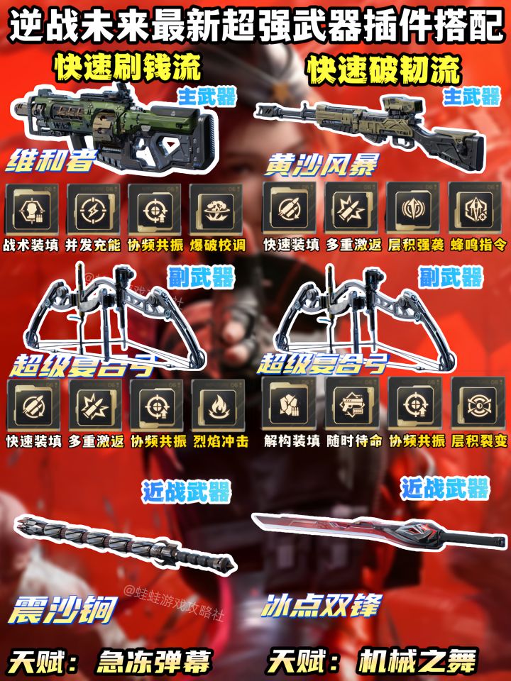 《逆战未来》全流派武器搭配抄作业!从前期过渡用的死亡猎手,到后期无限攻速流星海狂想、颗秒暴击流死神猎手、无限火力流纯白至上,还有刷钱、破韧、清屏、无限榴弹等专属配装。每套都包含主副武器插件、近战武器与天赋的精准组合,开荒速通、高难攻坚全覆盖,照着这套配,不管是刷怪还是打BOSS都能轻松拿捏,输出直接拉满,把把伤害第一