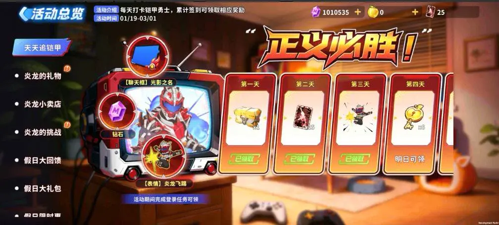 [活动任务]:每日完成随天数解锁,完成任意4天任务获得永久 “烈焰三连击” 人物动作,完成7天任务获得永久 “炎龙侠” 角色。